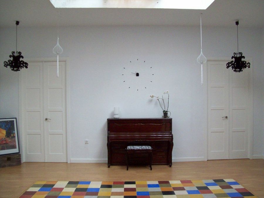 El lucernario quizá es el punto de mayor luminosidad de toda la vivienda. En este espacio nos encontramos con un piano en madera oscura que da el toque personal junto a la alfombra de colores. Atención al juego de simetría que se consigue con las lámparas, dando una sensación de orden y limpieza a todo el conjunto.