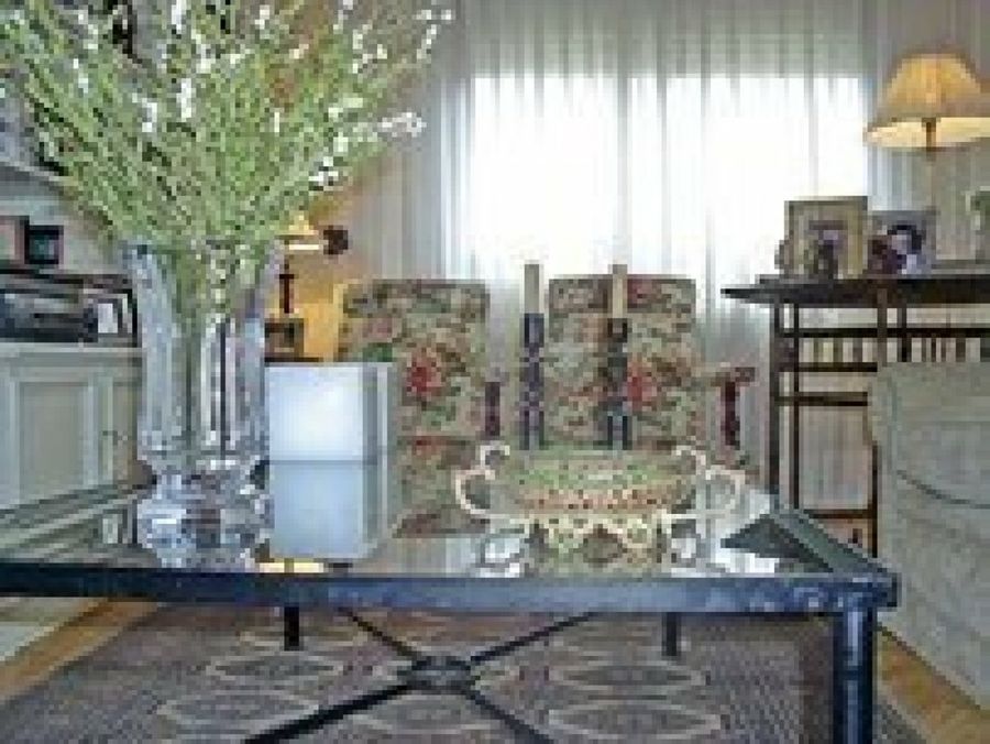El sofá, de actual tono tostado, decorado con manta de piel y frente a una clásica Boiserie lacada en blanco, junto con el combinado de hierro y teca, hacen una combinación perfecta entre todos los elementos, que dan al salón un estilo puramente neoclásico. Con ornamentos y colores que nunca se pasan de moda se consigue que nada se salga de esa armonía.