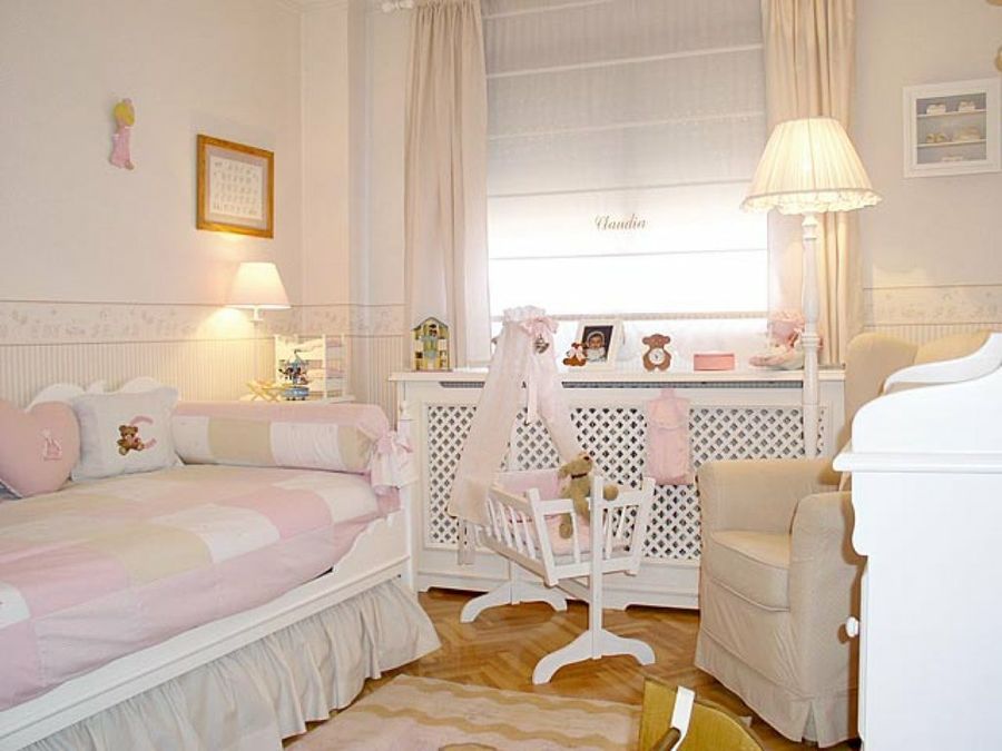 Un cubre-radiador de celosía hace las veces de mueble auxiliar donde poder colocar algunos objetos decorativos. En este caso el blanco sigue siendo el color elegido para combinar con el rosa.