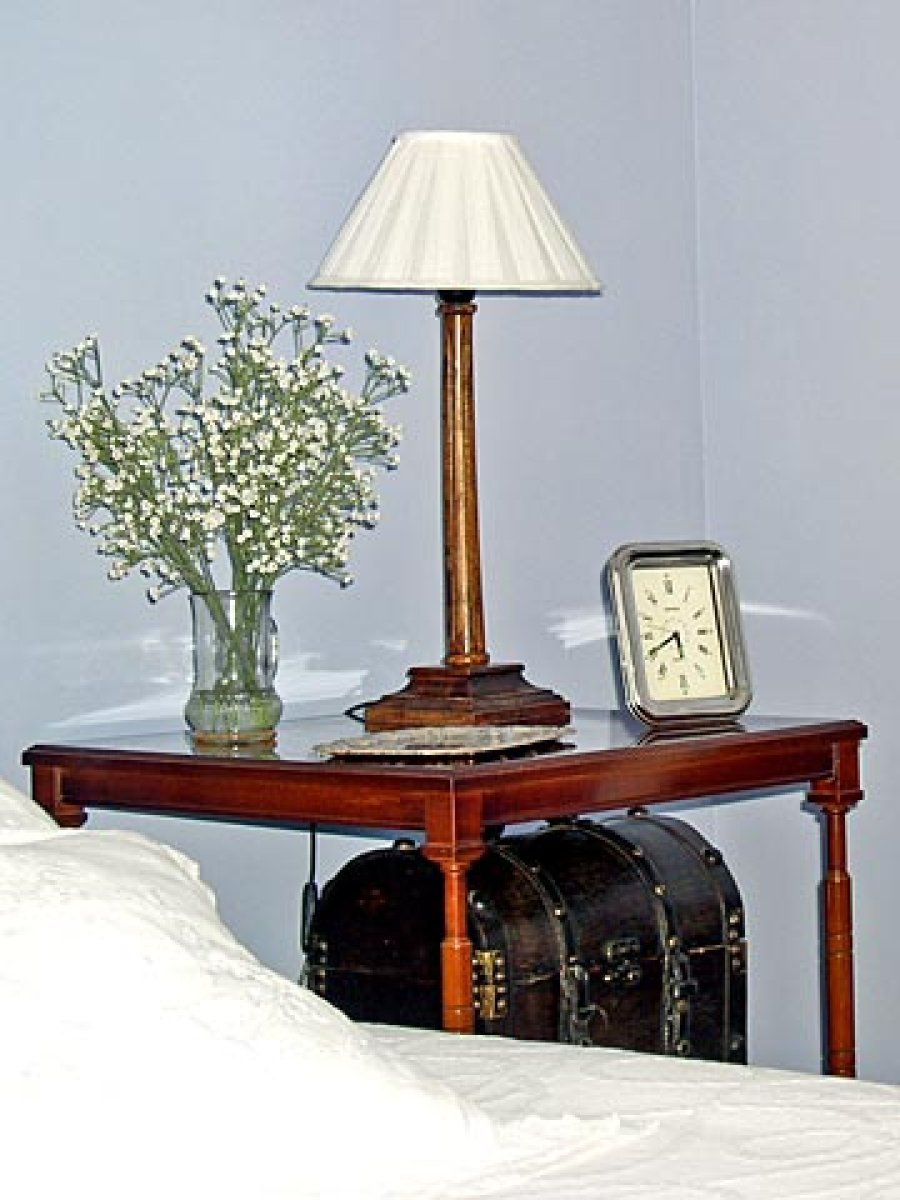 Las mesillas de noche altas de madera son de Cranky Style y la lámpara de KA Internacional. No falta el detalle de las flores que otorga al dormitorio un aire todavía más romántico.