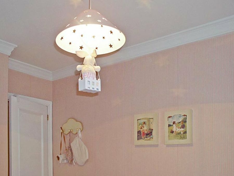 Al cuarto de juegos no le falta detalle: la lámpara imitando un globo con oso incluido, los originales cuadros de Cuadriman e, incluso, un perchero de nube detrás de la puerta, para colgar los bolsos de la pequeña. Las paredes cuentan con un friso de madera blanco que separa la parte inferior -pintada tono beige-, de la parte superior -empapelada con papel de Gastón y Daniela en rayas rosas y beiges-.