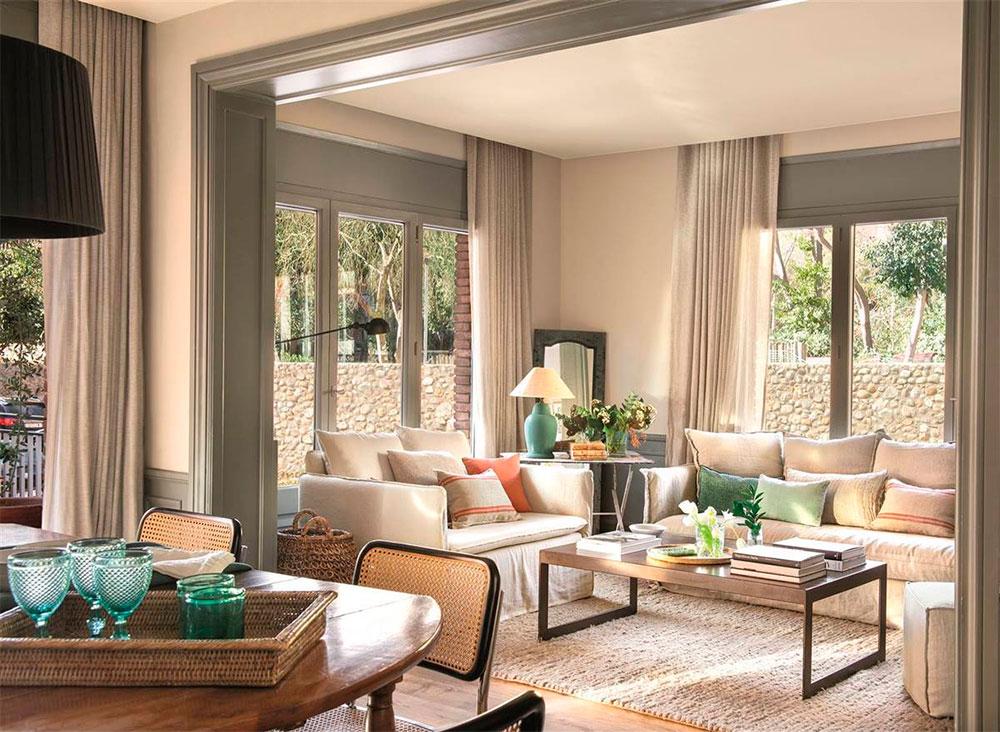 A pesar de lo que pueda parecer, es un color que aporta mucha luz, no oscurece. En esta casa se ha utilizado en todas las carpinterías e incluso en los muebles hechos a medida. En el salón por ejemplo, se ha combinado con un mobiliario ligero, como los sofás con fundas de lino de Margarita Ventura, o las cortinas del mimo material de Entretela, o los cojines verdes, también de lino, de Filocolore.