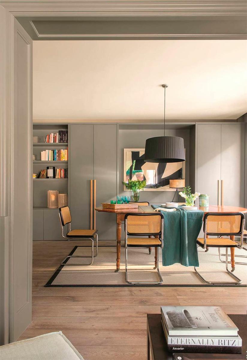 El recibidor a pesar de no tener luz natural, sigue con la misma gama de color, pero se ha conseguido iluminar bien gracias a la luz de ambiente. La consola de herencia se lleva todo el protagonismo. Igualmente en el comedor, la mesa también es una antigüedad francesa de Antrazita, así que se lleva la atención junto al conjunto de sillas Cesca, de Domestico Shop, un clásico para otro clásico, qué maravillosa composición. El mueble es un diseño a medida para guardar vajilla y mantelería, ideado por Bäse Interiorismo, con la misma carpintería del resto de la vivienda.