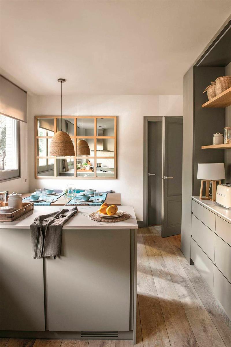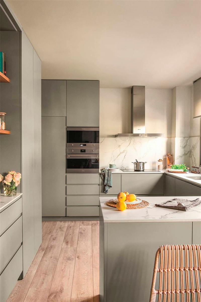 Resulta que mientras tomaba decisiones sobre qué verde elegir y consensuaba con el cliente y mi compañera, ha aparecido esta casa cuya base cromática es precisamente un gris verdoso que recorre toda la vivienda. En este caso, más gris y menos verde, con un resultado final realmente acogedor y envolvente.