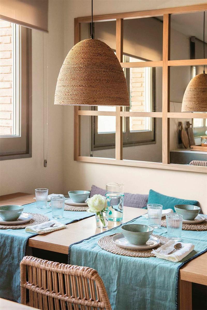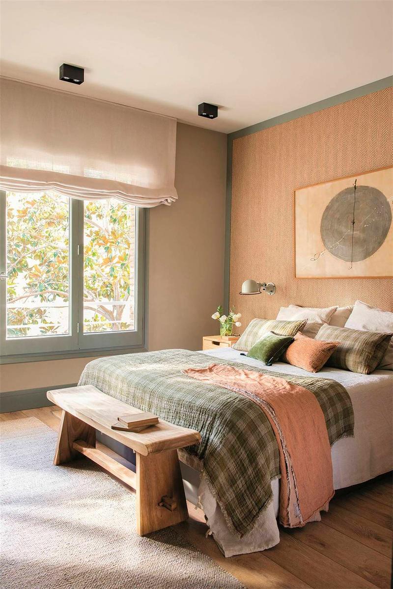 El dormitorio es otro remanso de paz, aquí han arriesgado un poco más con una idea que me ha parecido muy ingeniosa, en lugar de papel pintado han utilizado una alfombra vinílica para forrar la pared. La ventaja que tiene es que este tipo de tejido se puede fregar con un jabón neutro y un poco de agua, una bendición para los alérgicos como yo porque no hay posibilidad de que se acumule el polvo. Se ha confeccionado con tejido de moqueta Alfresko de KP. El banquito a pie de cama es de Catalina House al igual que las mesillas y la ropa de cama es de Filocolore. Y apostaría un riñón a que el cuadro que hay sobre el cabecero es de Blanca Cases, de Lu Ink Studio, llevo mucho tiempo siguiéndola en Instagram y esa obra lleva su sello.