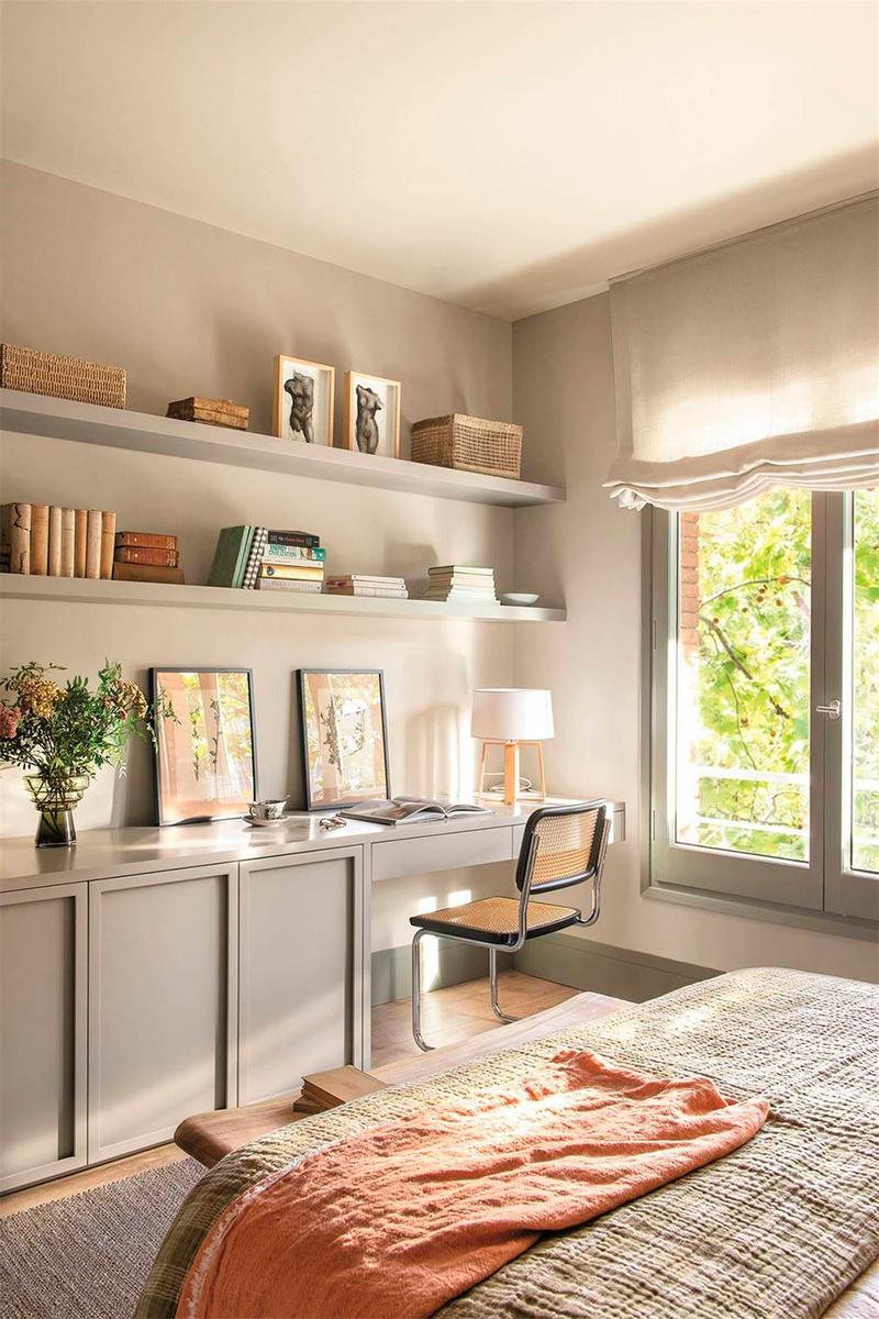 El dormitorio además incluye una zona de trabajo, vestida exactamente igual que los muebles del salón para conseguir esa continuidad y reforzándola con otra silla Cesca como las del comedor. Así trabajar en casa, en un entorno tan bonito, se hace menos duro.