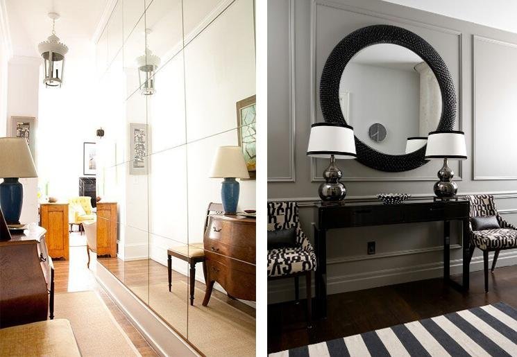 Un espejo instalado en una de las paredes del recibidor o en las puertas del armario consigue, además, aumentar la sensación de amplitud del hall. Si, por el contrario, no tienes mucho espacio, siempre puedes optar por colgar un espejo y crear un espacio como el de la imagen derecha: con mucho estilo basado en colores sobrios y simetrías.