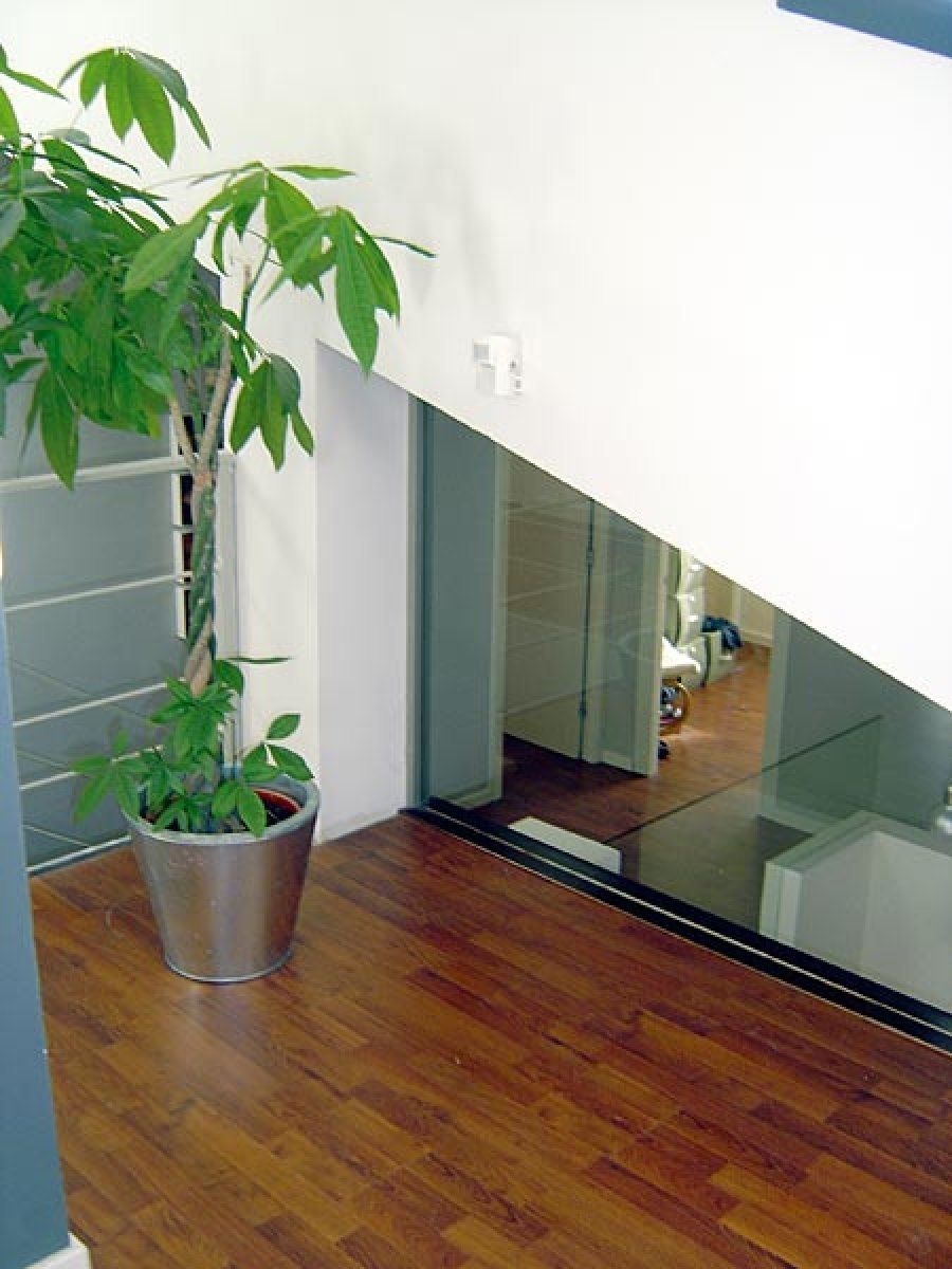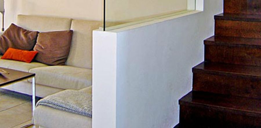 En las paredes de la escalera, lejos de crear volúmenes compactos, se ha optado por crear formas geométricas colocando una parte de vidrio. De esta manera se consigue más ligereza visual, lo que permite una amplia vista de los distintos espacios. Las paredes son blancas para resaltar la luz, combinadas con tonos grises y pequeñas pinceladas en naranja, para romper con la monotonía del color blanco. Se han abierto todos los espacios para permitir disfrutar de la luz en cualquier rincón de la casa, ya que se han creado unas oberturas superiores (en la cubierta y en distintas zonas) que permiten una entrada de luz continuada.