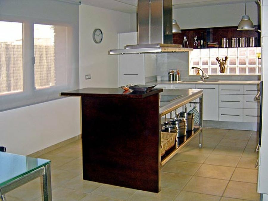 Gracias a la amplitud de la cocina, se ha creado un espacio de reunión, un lugar de comunicación con el resto de los miembros de la familia. Cada uno puede realizar una actividad completamente distinta en un mismo espacio sin perturbar a los demás. Al seguir la misma línea de la casa, se ha creído oportuno realizar un gran ventanal con pavés, dando una gran entrada de luz al espacio. Para el mobiliario de ésta se sigue utilizando el lacado blanco y el contrachapado de abedul con el fin de dar calidez al ambiente.