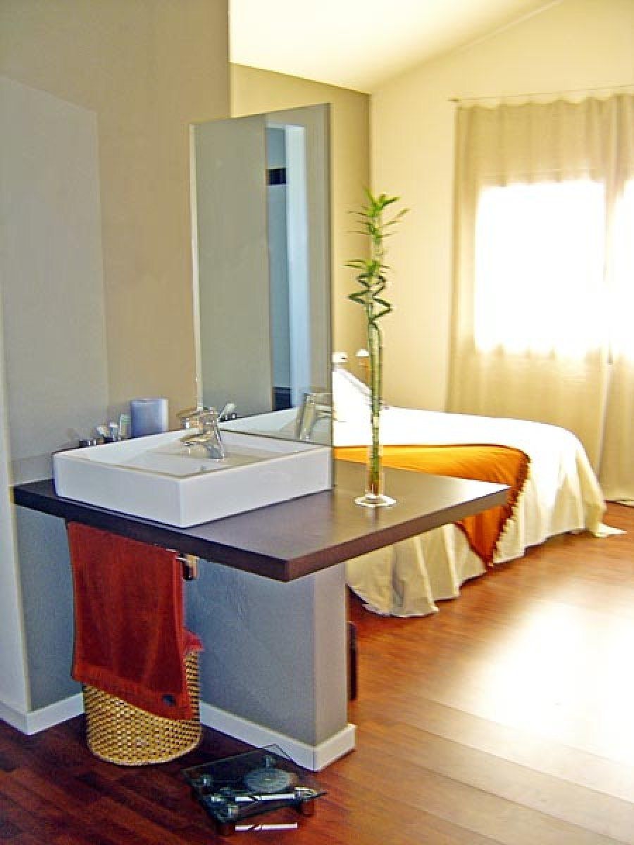 El dormitorio principal posee baño propio y vestidor. El baño está separado en tres zonas: el plato de ducha y la bañera, el w.c y, por último, el lavamanos, que por la parte trasera realiza la función de tocador. En él se mantiene la idea de los espacios diáfanos.