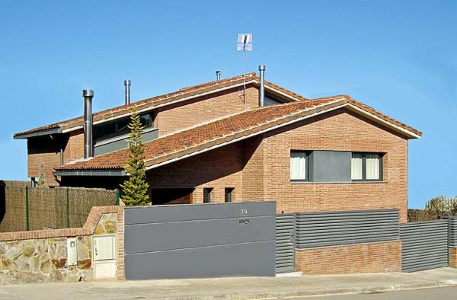 La fachada es de obra vista realizada con ladrillo manual y está combinada con un revestimiento de monocapa del mismo color que la carpintería de aluminio (en gris oscuro) y que el pavimento exterior (en pizarra).