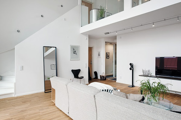 Cuando vi este duplex fue un flechazo y te lo tenia que enseñar. Es un gran ejemplo de como enlazar espacios y hacer una distribución más que acertada. En él los metros son super aprovechados ya que su punto fuerte es la distribución. Abajo gran salón comunicado por un pasillo con la cocina-comedor, más un dormitorio y baño al que han añadido un armario para guardar zapatos y materiales deportivos. Arriba otra sala de estar más dos dormitorios y baño. Todo esto sin mencionar sus terrazas en total 3 en el que disfrutar de los rayos de sol. Decoración muy cuidada todo basado en el blanco puro y toques inox dando modernidad al espacio.