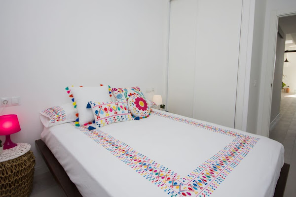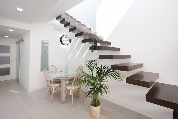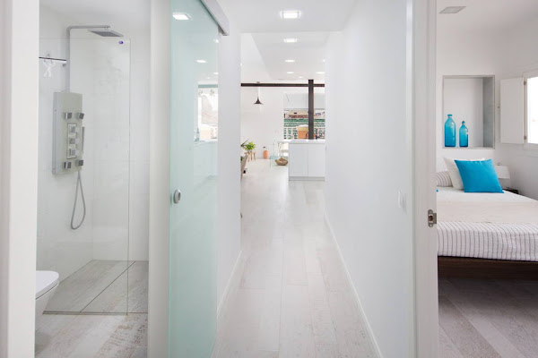 Aunque lo que más me ha gustado es el exterior, la decoración interior tampoco está nada mal. Sencilla (propia de un lugar de alquiler vacacional) y sobre todo fresca. Y esto último es muy importante si vives en Málaga o si vienes a pasar unos días en verano porque el calor en algunos momentos se puede hacer algo insoportable. Por eso es bueno tener una decoración como la que podemos ver en este apartamento, luminosa, amplia, sin recargar mucho los espacios y utilizando colores que ayuden a crear un buena sensación de frescor.Me gusta mucho el recurso de usar el cristal como material para crear esa sensación que os digo. Si os fijáis esta en las mesas, puertas y adornos.