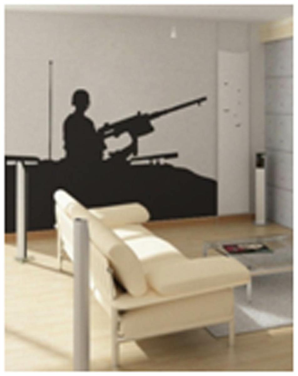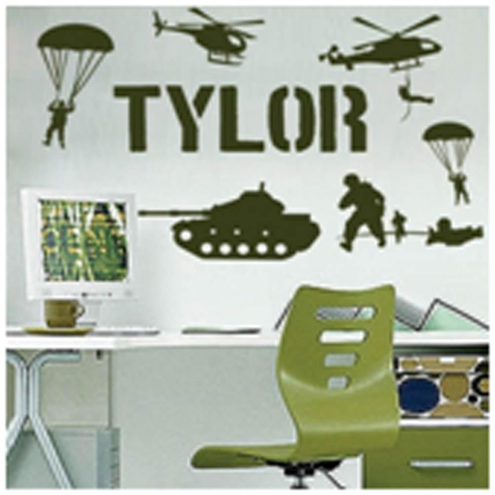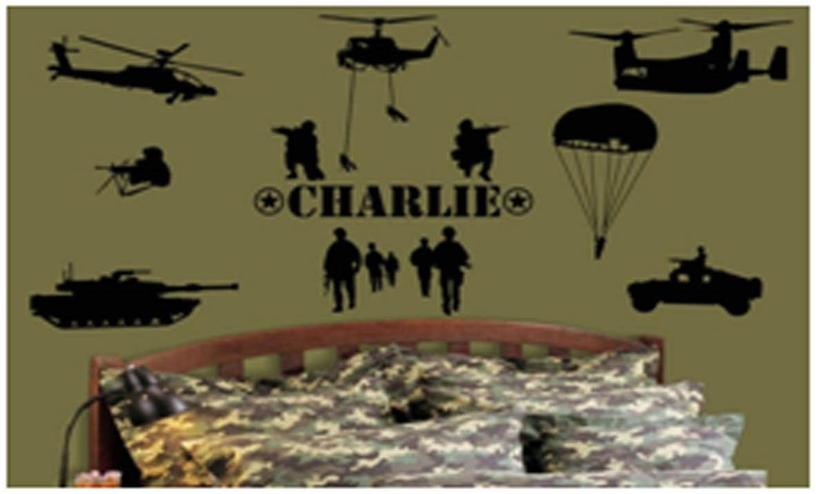 Hay varias opciones de vinilos de estilo militar, se puedes colocar vinilos pequeños en algunas paredes, que den un toque divertido al espacio como en estas imágenes: