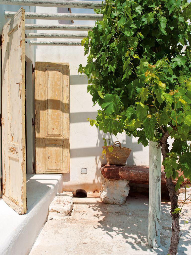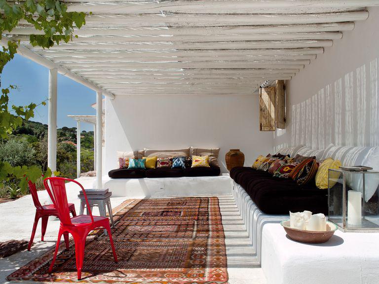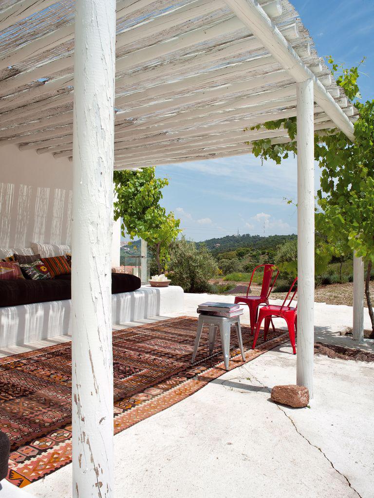En el exterior también encontramos un gran porche con una zona de estar. Las colchonetas de la bancada de obra llevan cojines vestidos con tejidos turcos y el kilim es una pieza antigua, le acompañan un par de sillas Tolix. Bajo la sombra de un árbol encontramos la zona de comedor, con mantelería de Poeira, vajilla de Bordallo Pinheiro, copas de Kenzo Maison y preciosas sillas del diseñador Piet Hein Eek.