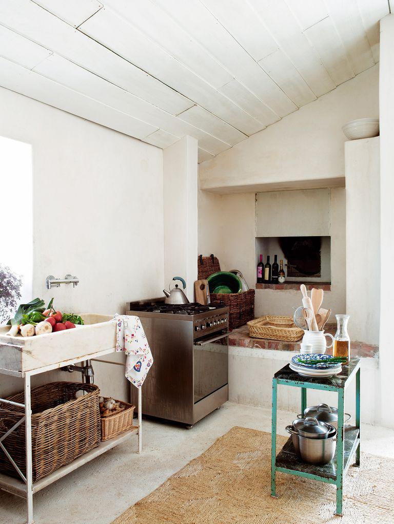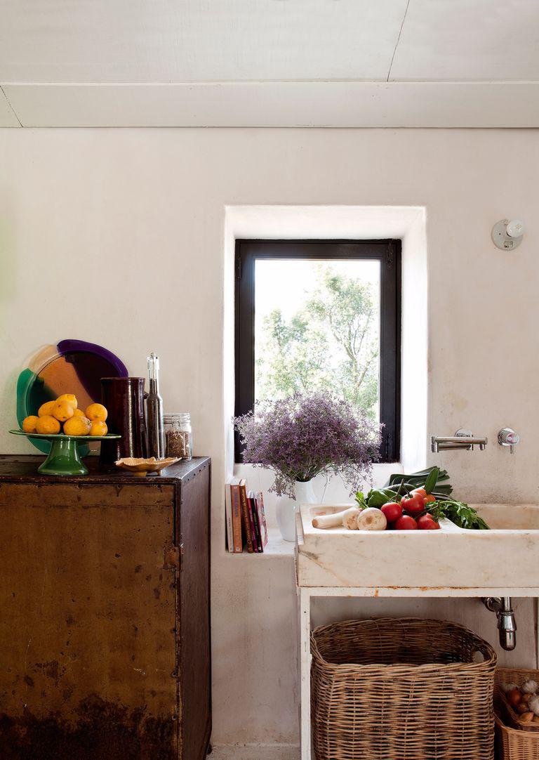 La cocina es sencilla, se conservó el viejo horno de leña y el gran fregadero de piedra que se montó sobre una estructura de hierro. Para dar un poco de apoyo a la cocina, un pequeño mueble auxiliar (también de hierro) hace las veces de mini isla con estantes.