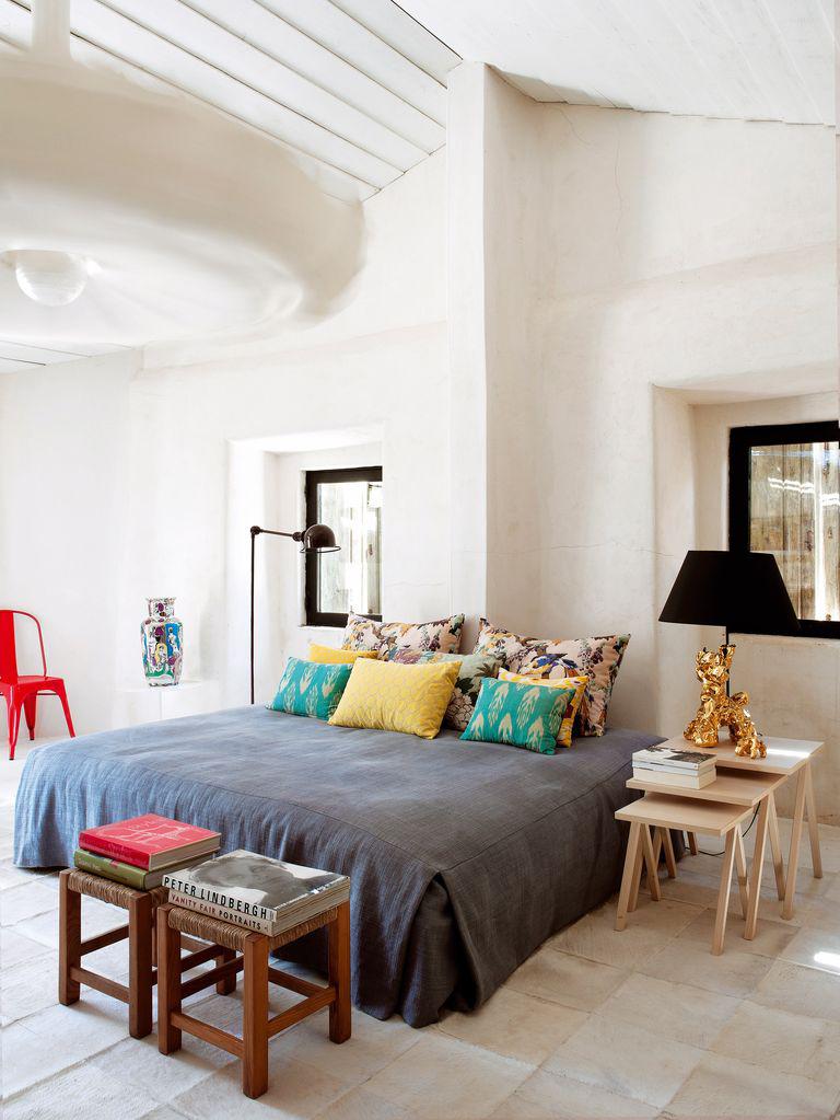 En el dormitorio se mezclan tejidos de diseño, como la colcha de Elitis, con cojines estampados de Etro o Neisha Crosland y otros comprados en Turquía. Las mesillas nido son de Capellini.