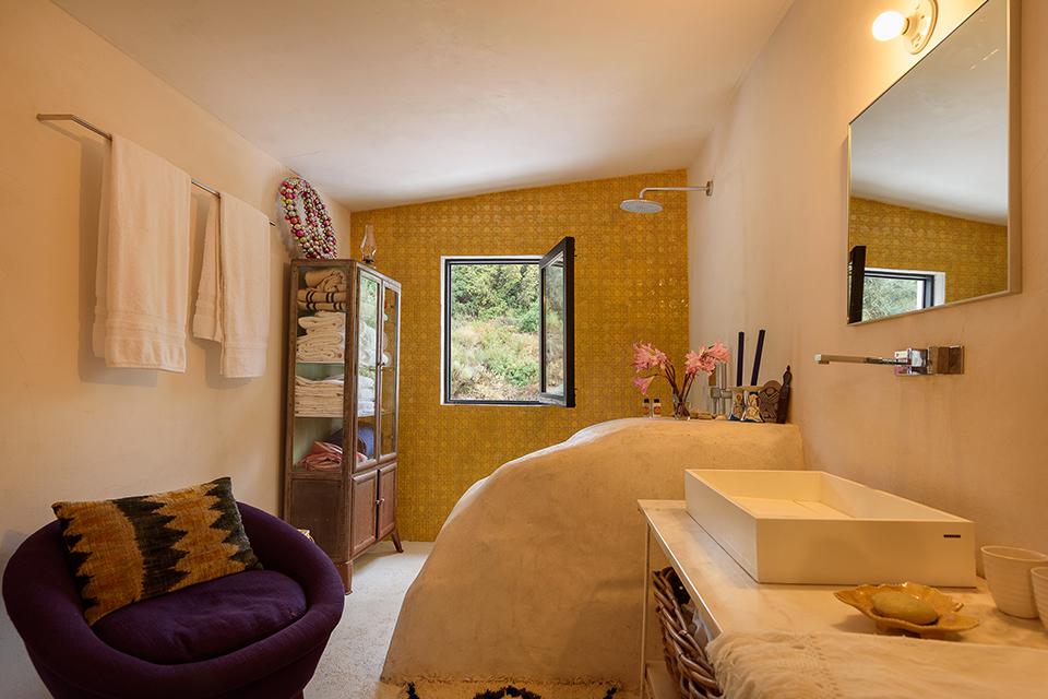 El baño, como el resto de la casa sigue siendo de hormigón, excepto la pared de la ducha a la que se le ha puesto un decorativo azulejo amarillo de la firma Bicesse. Muy llamativo también resulta la roca natural que separa la ducha del lavabo y que se ha pintado como el resto del baño para integrarla, hace las veces de mampara.