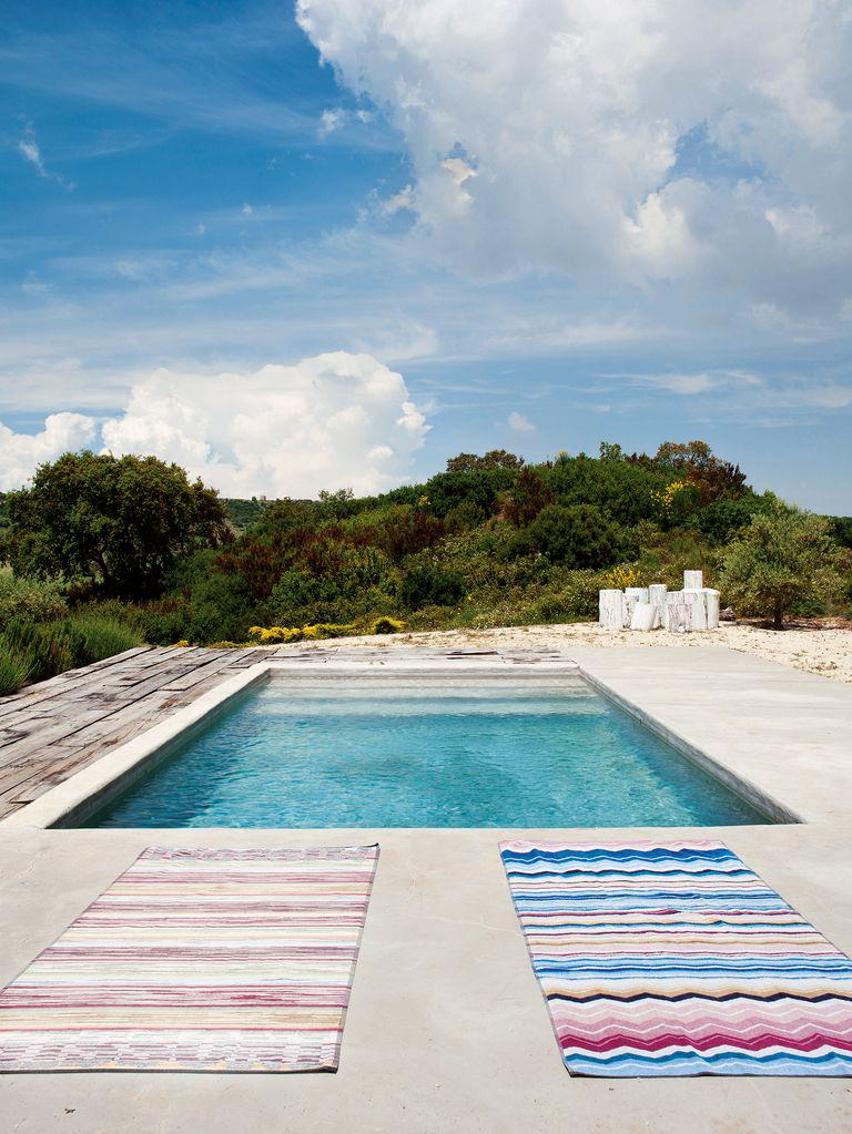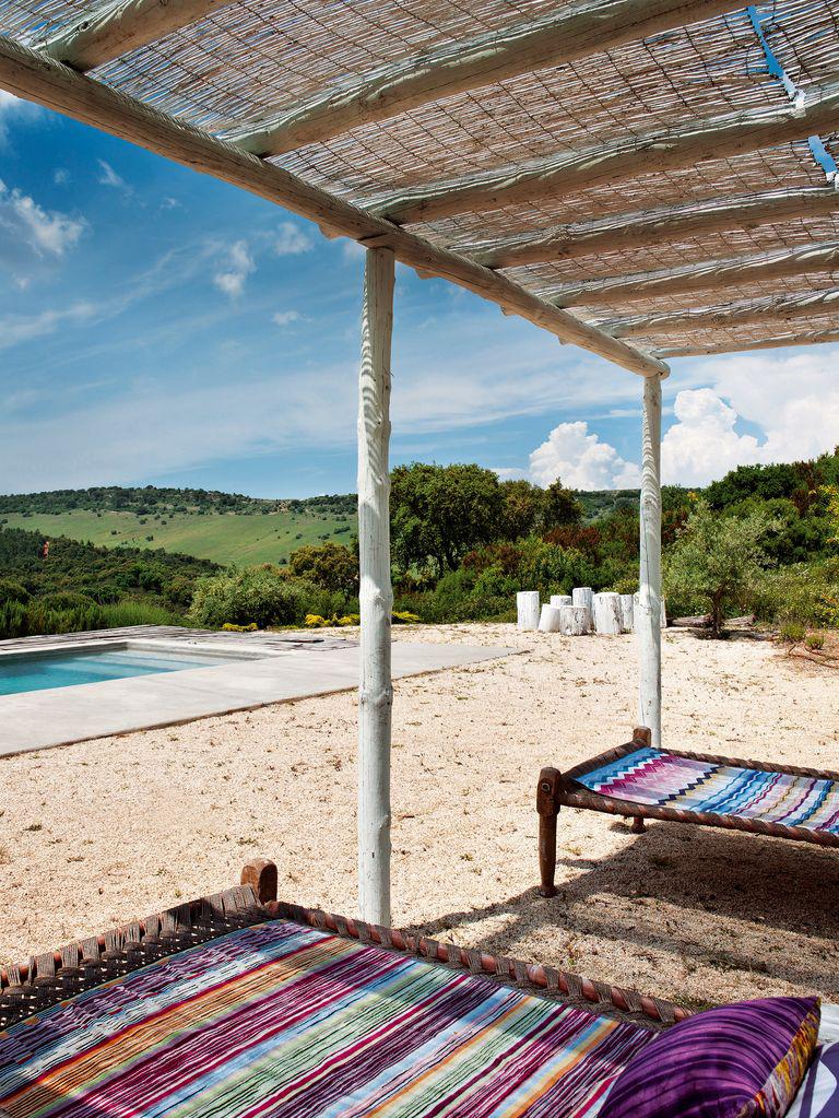 No puede faltar una piscina y a su vera, una pérgola de madera encalada y cañizo. Bajo ella, dos tumbonas de origen indio. El hormigón llega hasta el vaso de la piscina, aunque se mezcla con algo de madera en su lateral, siguiendo así, el esquema general de toda la casa.