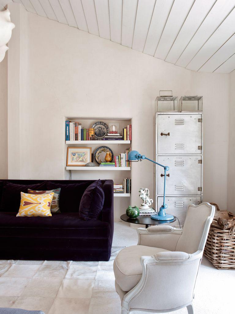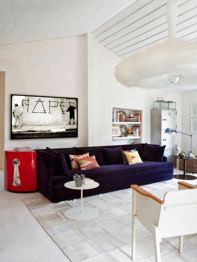 La alfombra y el sofá, con terciopelo de Designers Guild, proceden de su tienda y las mesitas son el modelo Gong de Capellini. La lámpara del salón es de Flos. El divertido mueble auxiliar rojo, que sirve de apoyo al sofá, es de Fornasetti. Destacan los detalles industriales como la lámpara articulada Jieldé y el armario de hierro.