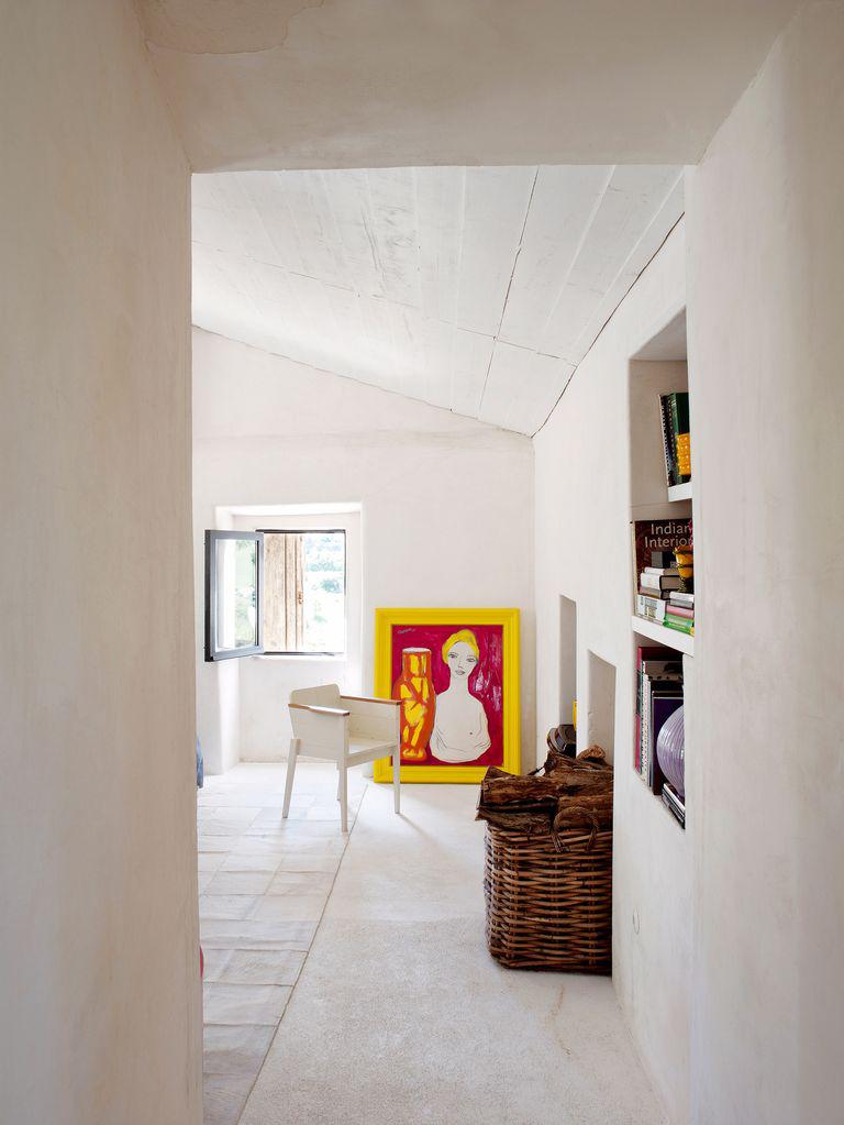 También se utiliza el arte como elemento de contraste, como la obra que reposa en el suelo, de la artista brasileña Isabelle Tuchband, en tonos fucsias y amarillo que rompe que con el blanco que impera a su alrededor. Junto al cuadro, una butaca recuperada del holandés Piet Hein Eek.