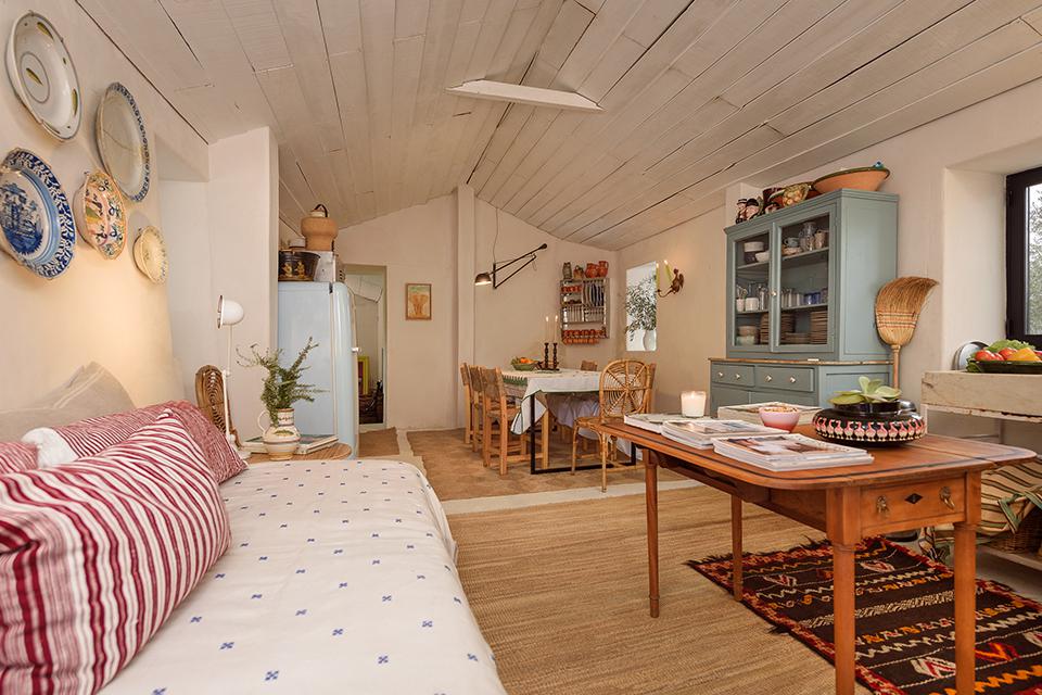 Precisamente la casa que os traigo hoy está en Portugal, más concretamente en la localidad de Palmela, muy cerca de Lisboa. Es un proyecto de la interiorista Mónica Penaguião, propietaria del estudio y tiendas Poeira. La construcción, de procedencia agrícola, mantuvo su esencia gracias al encalado de las paredes, a sus maderas pintadas, al blanco en paredes y techos que potencian la claridad junto con los espacios poco compartimentados y a la presencia de un único pavimento que lo unifica todo, el cemento pulido.