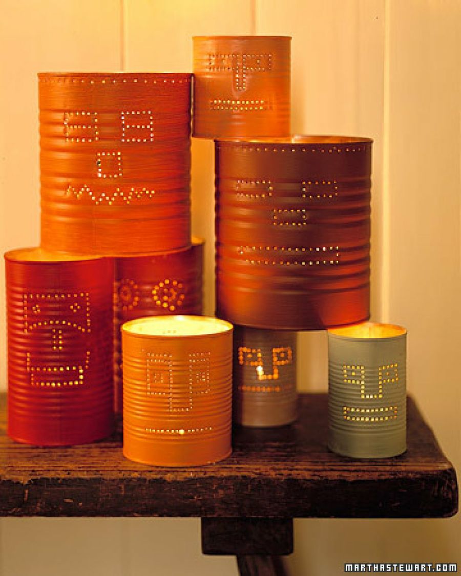 Una manualidad muy sencilla que podemos hacer con niños, seguro que están encantados de participar en la decoración, es pintar latas. Sólo vamos a necesitar algunas latas vacías (cuidado con los bordes), papel de colores y un punzón para hacer las caras.