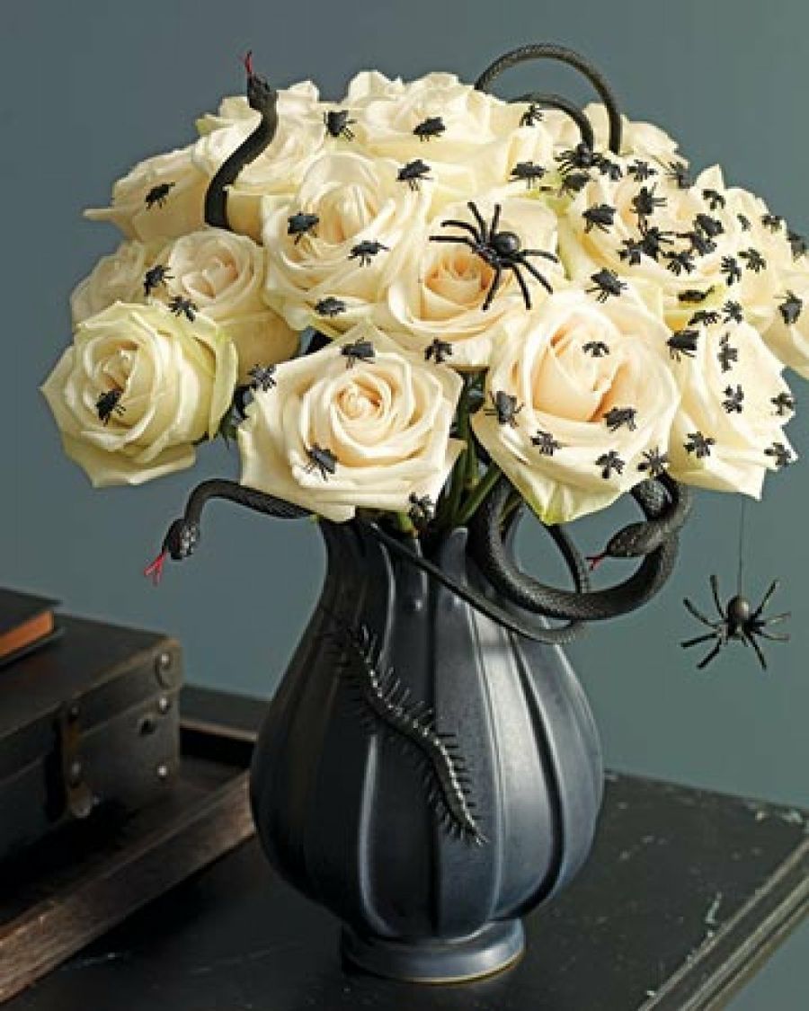 Normalmente en casi todas las casas hay algún ramo de flores a modo de centro de mesa en el salón. Podemos comprar arañas y otros insectos en plástico y ponerlos alrededor de las flores para conseguir un detalle realmente tétrico.