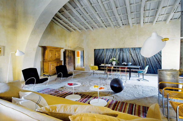 Un interior lleno de piezas escogidas como las sillas originales de Marcel Breuer y de Jean Prouvé y la estantería contigua, la pareja de sillones franceses del s. XIX. El sofá está hecho a medida y en tonos crema contrasta en armonía perfecta con los toques en amarillo de las sillas y los detalles decorativos. La zona de comedor está abierto y comunicado con el estar-salón creando un espacio a modo de prolongación de la zona exterior. Recuerda a una terraza con la foto del fondo y los suelos de piedra.