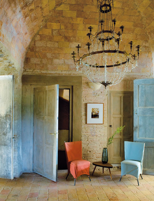 Deslumbrante, una lámpara italiana del siglo XVIII ilumina las piezas del hall de entrada: dos sillas Jour et Nuit, de Garouste et Bonetti, el taburete de tres patas original de George Nakashima, un jarrón alemán años 30 y la obra del artista Thomas Ruff colgada en la pared. Un rincón soberbio y sereno con la calidez de los espacios de campo. Las paredes de cal y pigmentos naturales le confieren la elegancia a una vivienda três-chic.