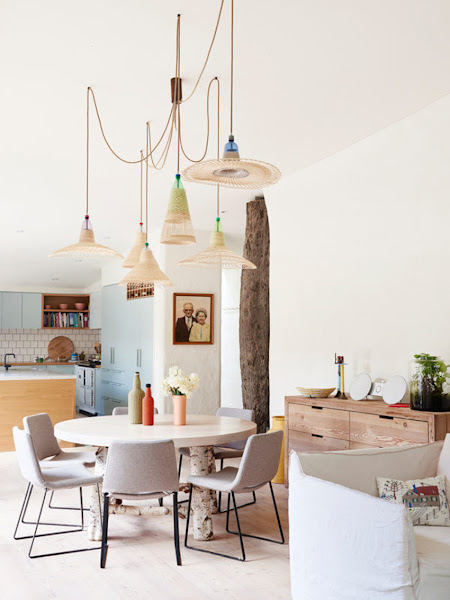 El estilo ecléctico me ha conquistado totalmente, el mobiliario en madera clara, las fibras naturales de las lámparas, sus vigas recuperadas antiguas, el "total white" de las paredes, la colorida decoración en textiles que le aportan este toque boho que tanto me atrae ultimamente...