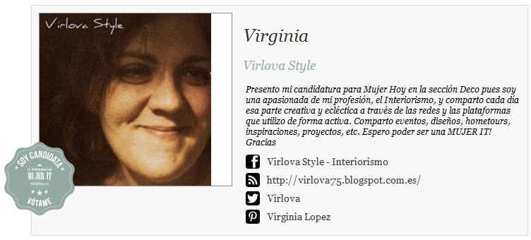 Estoy muy contenta porque soy Candidata a los II Premios MUJER IT de Mujerhoy.com en la sección Deco. Os animo a todos a perder un minutito de vuestro tiempo ( más que el que ya perdéis cada día en leerme ) y votadme si creéis que puedo ser la Mujer IT que están buscando!! hasta el 21 de mayo podéis votar!