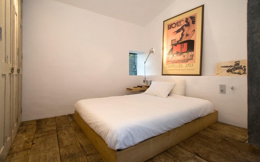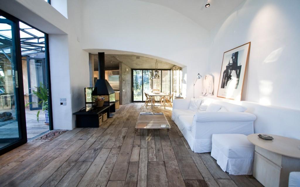 En cuanto al uso de los materiales, se limita la paleta: por un lado el encalado blanco del cuerpo original de la masía, intentando respetar al máximo la construcción existente, y por el otro, el enlucido de cemento en toda la parte de la ampliación. Con ello diferenciamos rápidamente lo nuevo de lo antiguo, que queda cosido por el pavimento continuo de tarima de maderas de recuperación.