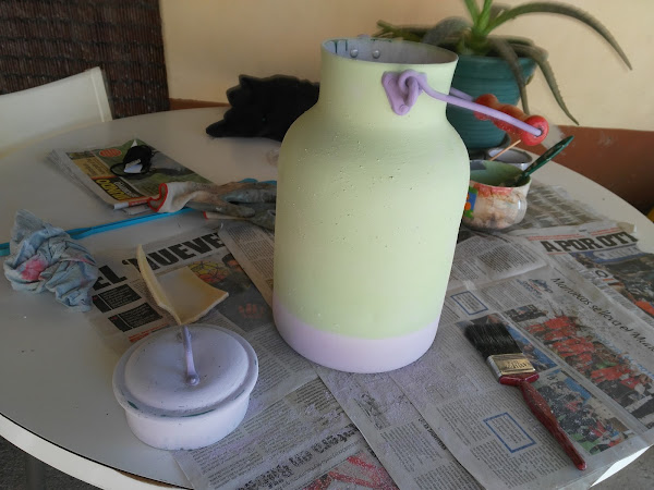 Después hice lo mismo, pero con un color verde pálido, similar al de la servilleta. Para el asa de la tapa usé un color acrílico rojo, igual al de el agarrador de madera de la lechera