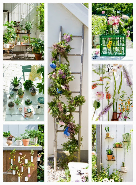 Las plantas y flores decoran por sí mismas, pero también me gusta ver ideas como las de estas fotografías, plantas sobre una estantería-escalera, crasas en bonitas macetas, una escalera sobre la que colocar una trepadora, pequeñas baldas hechas con trozos de tronco de árbol...