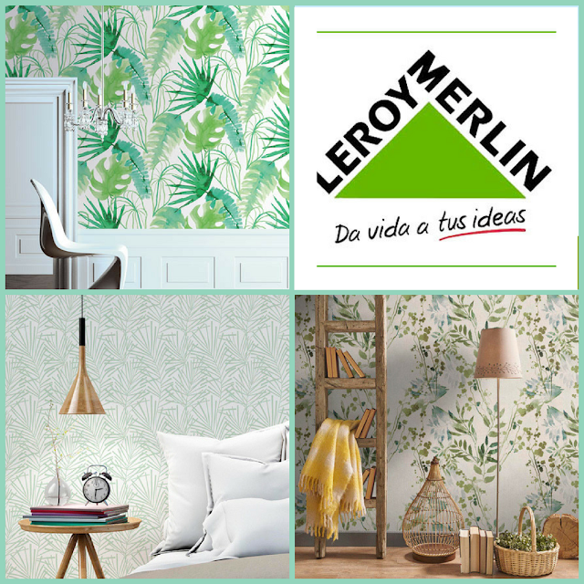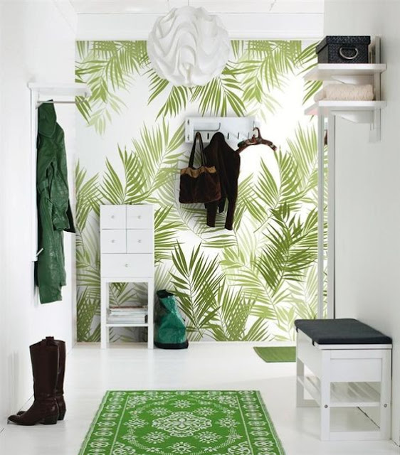 No hace falta que sea todo muy blanco… Pintando las paredes laterales en blanco, puedes colocar un bonito papel pintado en la pared frontal de la entrada, que le de un toque de estilo al lugar. Si te encanta la decoración tropical, podrías poner un papel similar a éste: