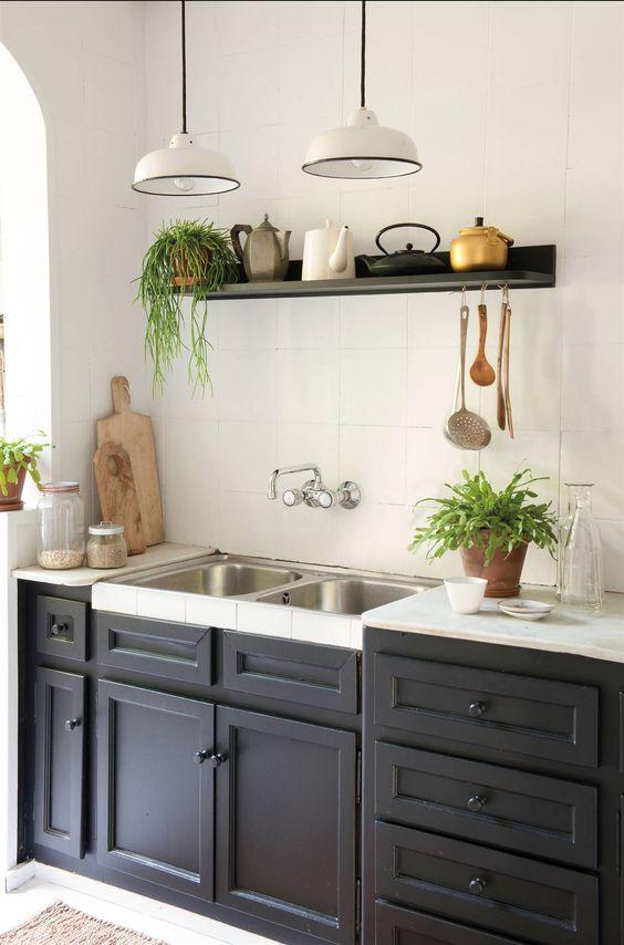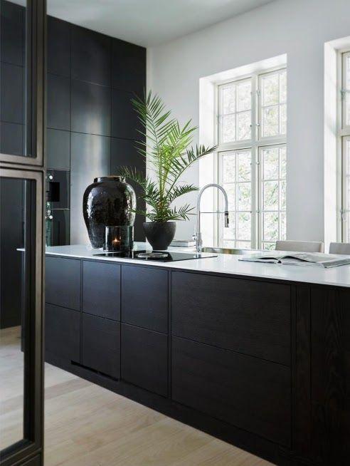Ya sea con muebles de madera negros, combinados con azulejos o mármol blanco y madera natural. Como si es totalmente negra.