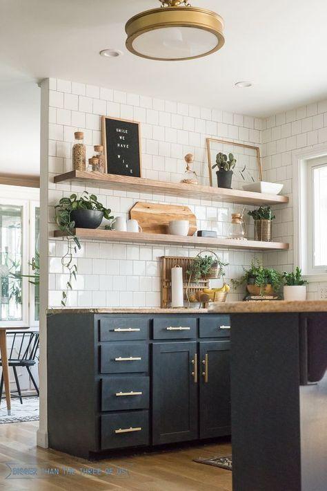 La armariada de arriba de la cocina, cada vez más, tiende a desaparecer, para dejar así espacios más limpios y más ligeros, visualmente. Sustituyendolos así, por estantes. Como te muestro en las siguientes imágenes.