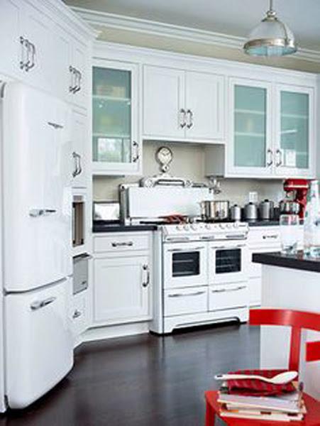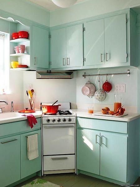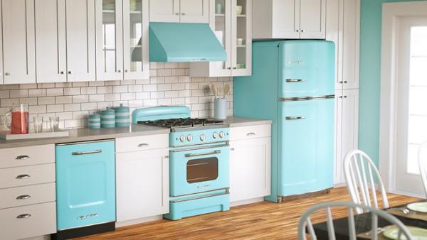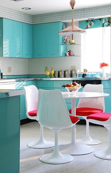 Me encantan las cocinas con aire retro, con mobiliario y colores que recuerden las cocinas de los años 50, 60. Como vais a ver en las imágenes que he seleccionado, en estas cocinas los colores pastel se llevan la palma, especialmente los azules turquesa, rosas, combinados con otros mucho más cañeros como los rojos y amarillos. El uso del acero inoxidable, tanto en encimeras como en tiradores también ayuda a darle el puntito retro que buscamos.