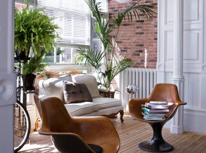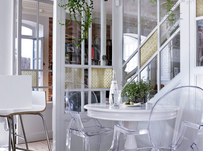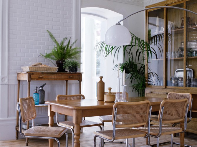 La sala de estar-comedor está completamente cubierta de madera, un piso de madera de pino pintada, con creación de espacios amplios y mucha luz. Las paredes están cubiertas con cerámica de metro blanco, realzada por pequeños toques de ladrillo rojo. El mobiliario refleja la pasión de los diseñadores de interiores por el viaje: fueron desenterrados en los mercados de antigüedades de toda Europa: Amsterdam, Cascais (Portugal), Portobello (Londres) o en Francia ... Protagonista en el comedor, un escaparate monumental y en armonía, mesa, sillas Thonet y la consola se dividida en los tonos de la madera.