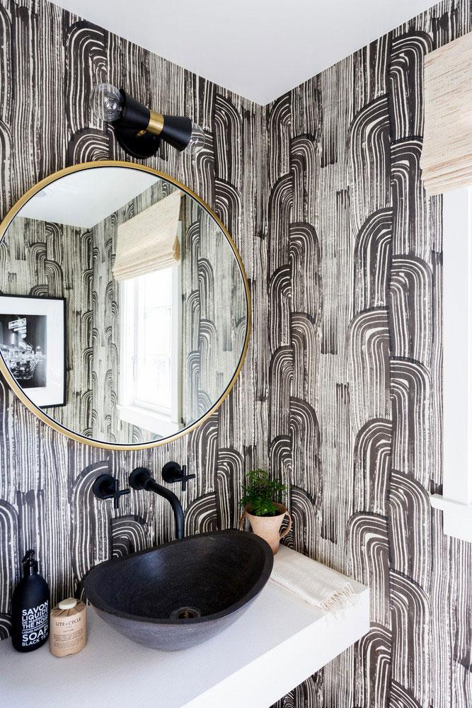 El aseo se decoró para sorprender. El papel pintado se llama Crescent y es de Kelly Wearstler, se completó el espacio con un fregadero de piedra sobre encimera, unos apliques de corte mid-century de la firma Cedar & Mos y un precioso espejo de metal redondo de West Elm. La chimenea de la sala de estar, era rancia y aburrida, con piedra gris que la cubría, se sustituyó por pizarra negra que le da un aspecto más moderno.