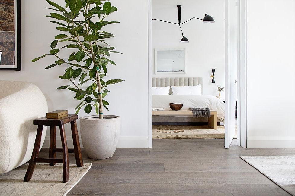 Para la decoración se decidió utilizar una paleta de color natural, se buscaba que el resultado fuera atemporal, neutro y simple, pero sin que resultara frío. Para lograr el equilibrio entre algo tan neutral pero con resultado acogedor, se recurrió a las texturas y a la incorporación de piezas vintage. Una vez más la mezcla de lo viejo y lo nuevo. En la sala de estar por ejemplo, la antigua mesa de centro de corte oriental, se acompaña de unas banquetas de madera y caña (segunda imagen) que aportan textura en forma de fibra natural, los cojines también antiguos, marcan la diferencia.