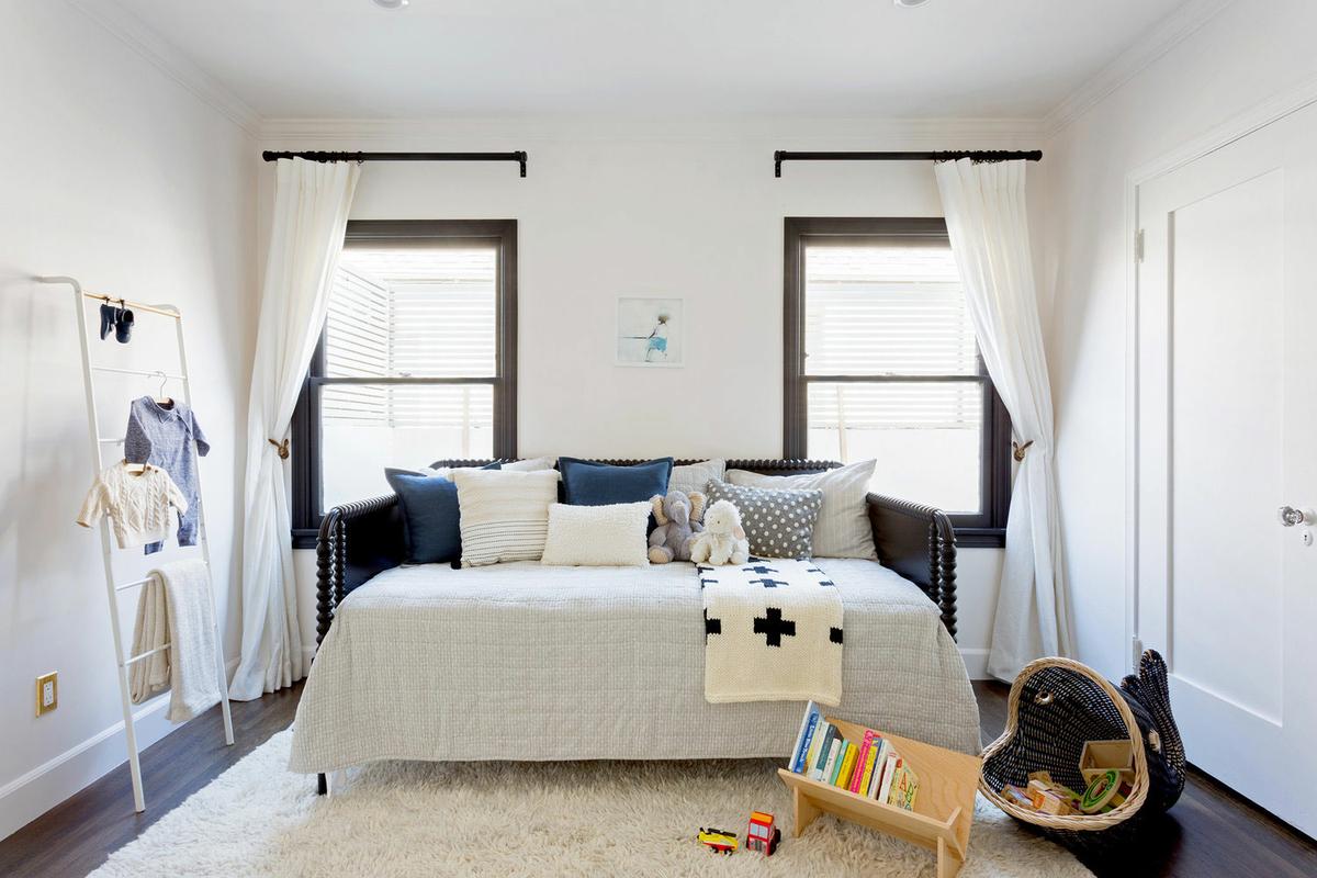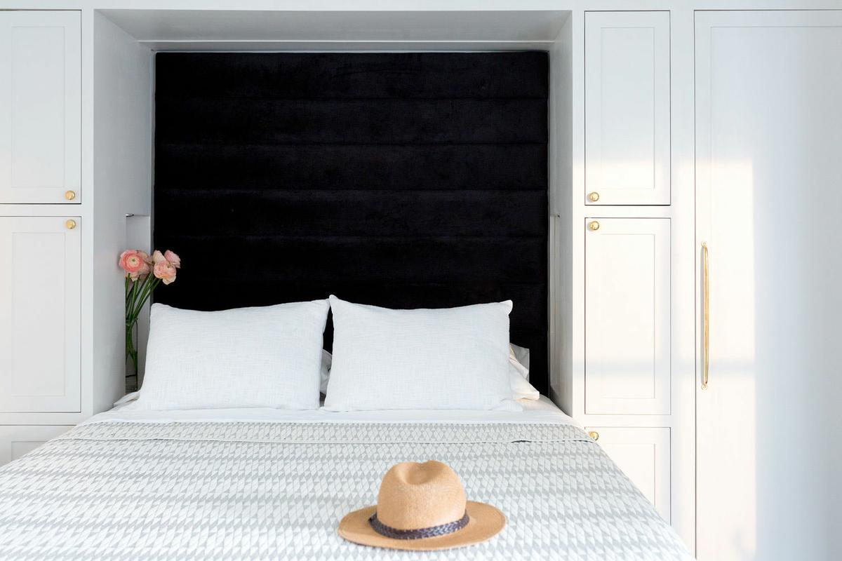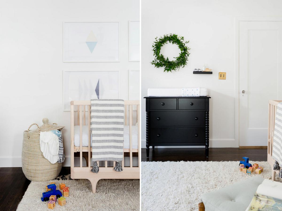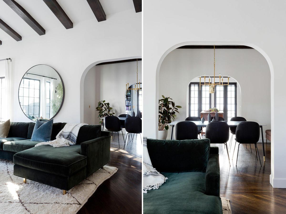 Las tonalidades utilizadas para decorar esta casa también son muy de mi estilo. Esa combinación que tanto me gusta de blanco, negro y dorado, aderezado con un poco de madera, nunca falla. También la mezcla de estilos, que si os fijáis en detalle hay muchos pero bien elegidos. Piezas Mid-century, con otras de corte más moderno, nórdicas en la habitación del bebé,… muebles de aquí y allá que conviven en perfecta armonía. Ah! y quién lo diría, ya sabéis que no soy muy de verde, pues el sofá seccional de terciopelo en este color, me ha robado el corazón. Además, no podría quedar mejor sobre una alfombra Beni Ouarin y coronado por un espejo “oversize” redondo. ¡Que me pongan el pack para llevar!