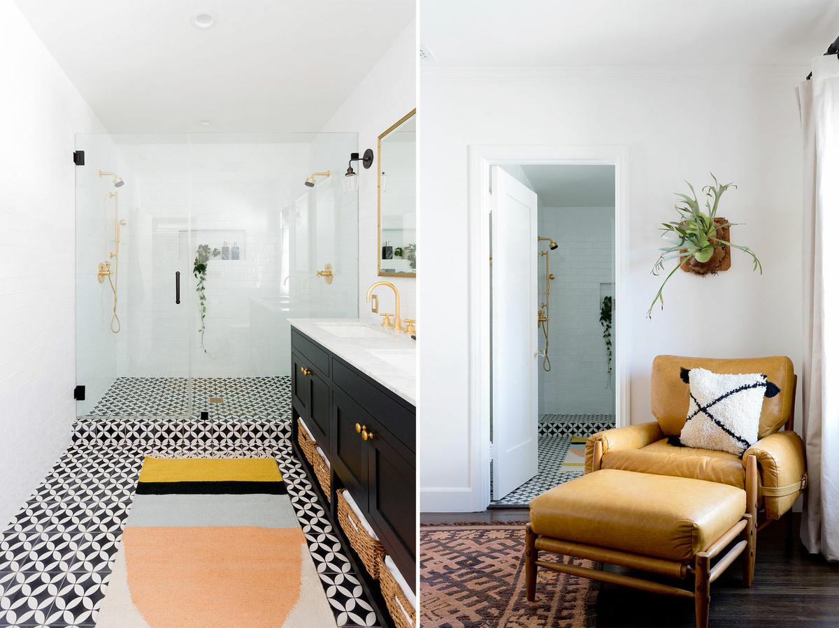 Si cuando lleguéis al baño no exclamáis ¡Wow!, entonces es que nuestros gustos difieren de los míos :-) Quizás lo que más me ha llamado la atención es el uso que hacen de los revestimientos hidráulicos, se extienden por toda la superficie (incluida la ducha) dando continuidad al espacio. Me refiero a que estoy acostumbrada a ver en baños con ducha, un cambio de material en la zona de aguas, y me ha parecido un acierto utilizar el mismo para todo (siempre y cuando hablemos de materiales aptos para zonas húmedas).