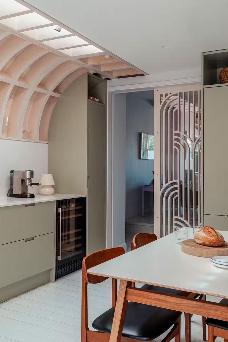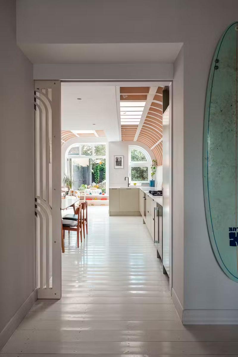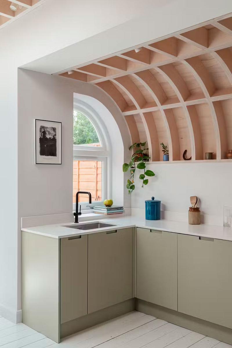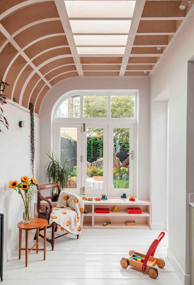 La pequeña casa victoriana ya existente, sufrió una remodelación por la parte del jardín a la que se le adosaron dos extensiones algo inusuales. Como el presupuesto era muy ajustado, se inspiraron en las técnicas de construcción naval utilizando para ello, contrachapado de abedul en el techo creando así, esta forma tan característica como de casco de barco invertido que le aporta visualmente mucha amplitud, y al tener forma curva, ocupa menos espacio (tenían el hándicap de estar muy pegados a las casas colindantes). Para aportar más luz, en la parte más oscura de la cocina (al fondo, donde no hay ventanas) se instalaron tragaluces en los techos, de esta manera la iluminación natural estaría garantizada en toda la estancia.