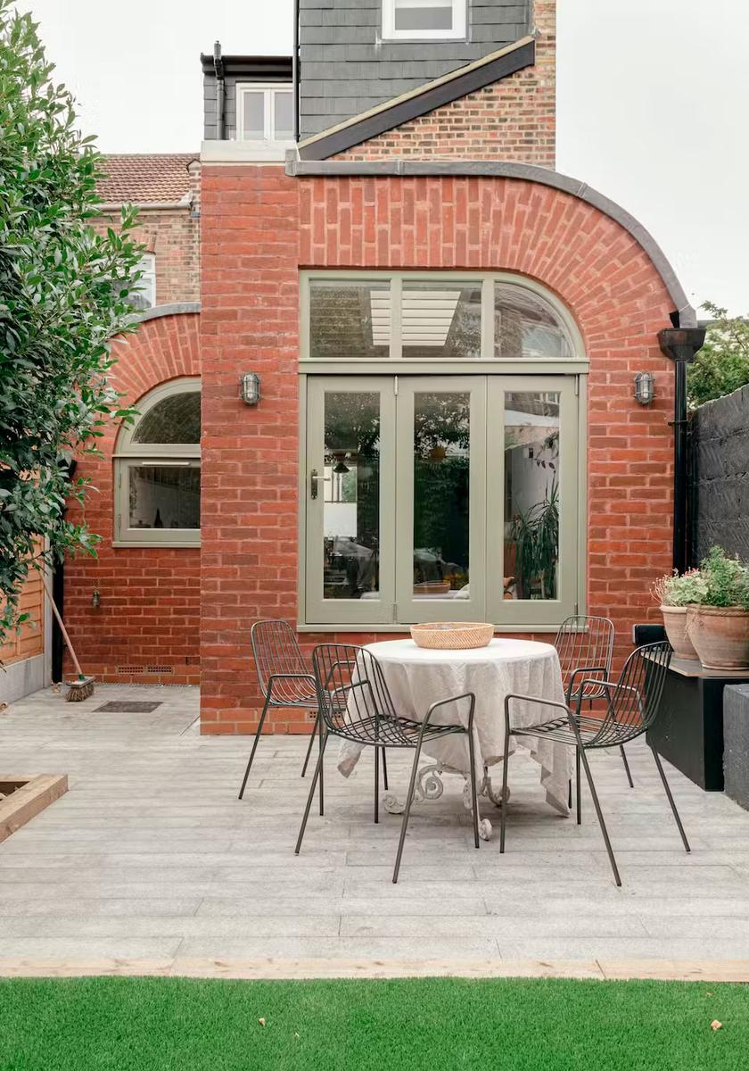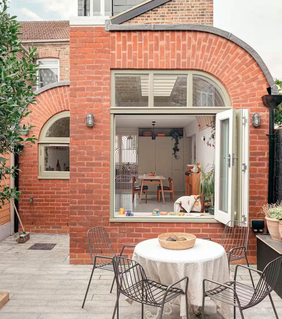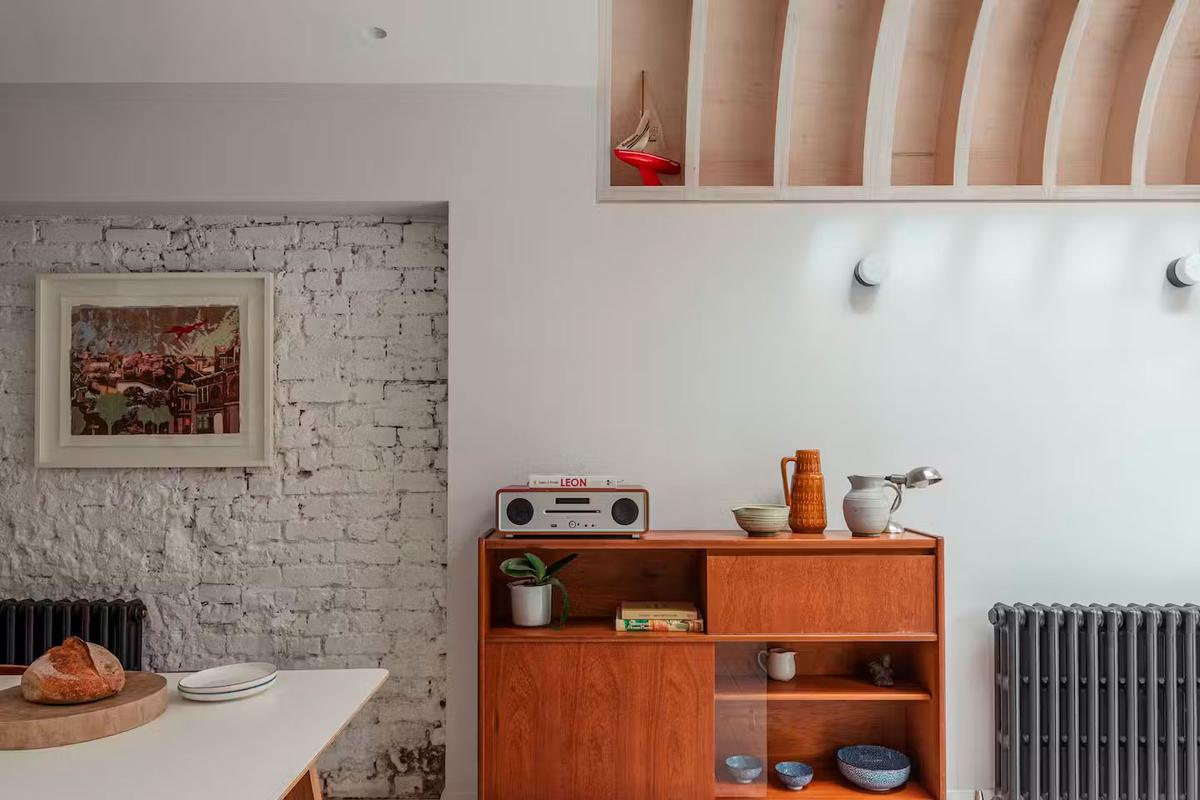 La pequeña casa victoriana ya existente, sufrió una remodelación por la parte del jardín a la que se le adosaron dos extensiones algo inusuales. Como el presupuesto era muy ajustado, se inspiraron en las técnicas de construcción naval utilizando para ello, contrachapado de abedul en el techo creando así, esta forma tan característica como de casco de barco invertido que le aporta visualmente mucha amplitud, y al tener forma curva, ocupa menos espacio (tenían el hándicap de estar muy pegados a las casas colindantes). Para aportar más luz, en la parte más oscura de la cocina (al fondo, donde no hay ventanas) se instalaron tragaluces en los techos, de esta manera la iluminación natural estaría garantizada en toda la estancia.
