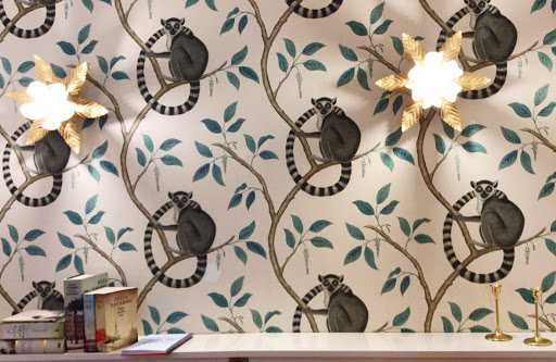 El mobiliario de la cocina, blanco lacado, tiradores de concha y una encimera de silestone blanco nieve, tan sencillo pero con toques de distinción como el azulejo metro del salpicadero de la cocina y el resto empapelado con papel pintado en un tono gris verdoso estampado con plumas muy suaves, pura elegancia.
