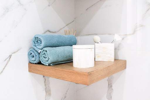 Para el baño queríamos atraer el descanso y desconexion, como ayudándonos de materiales naturales, porcelánico imitando al mármol y un pequeño mural con mosaico de mármol, una pieza preciosa que hace un delicia de baño. Complementos en negro, madera para el mobiliario y toques dorados, ¡Viva la elegancia del Glamchic!