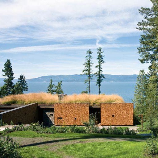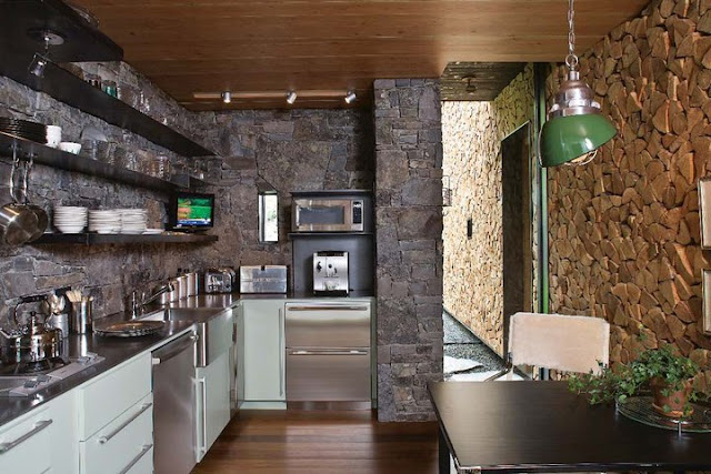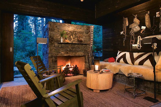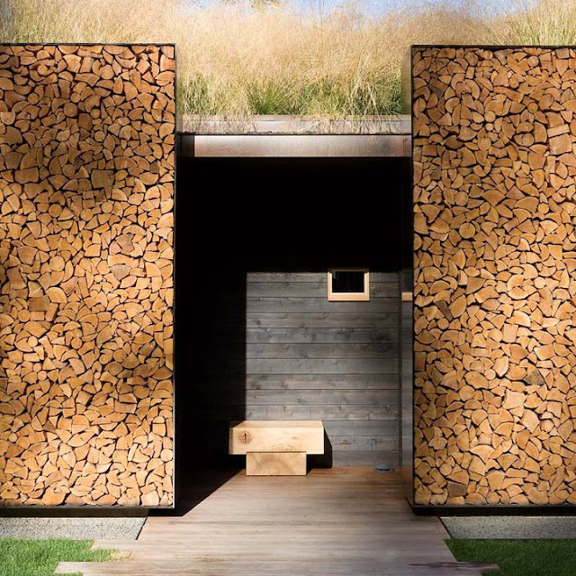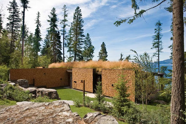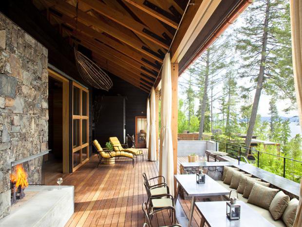 Me llama mucho la atención la utilización de los troncos de madera en la fachada principal , combinada con la piedra gris y por supuesto el porche con sus espléndidas vistas al lago..