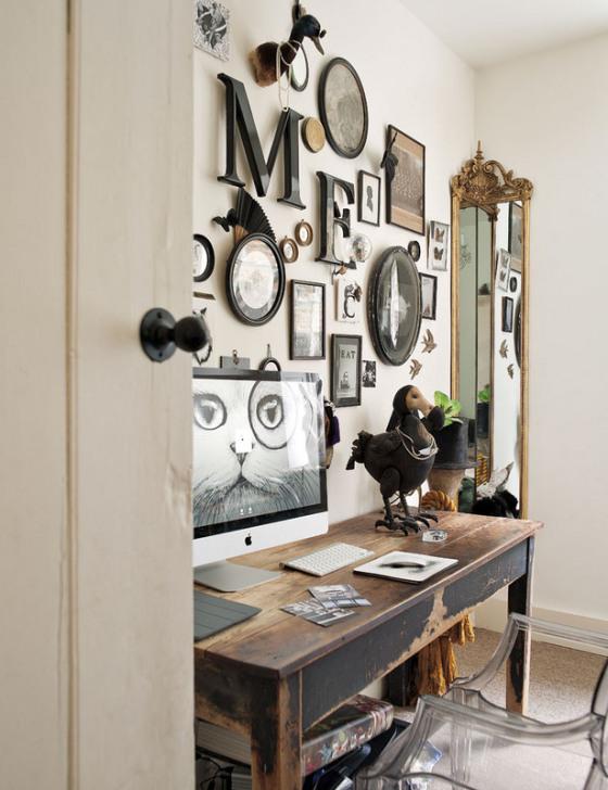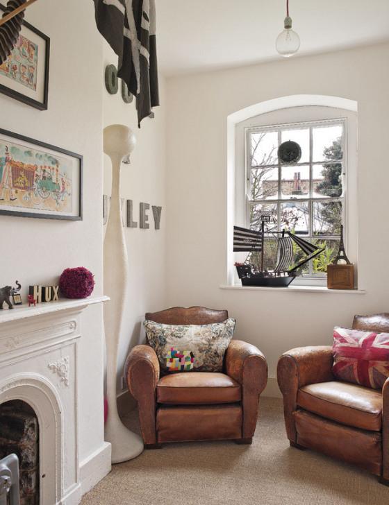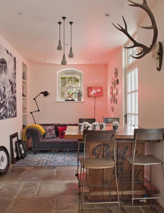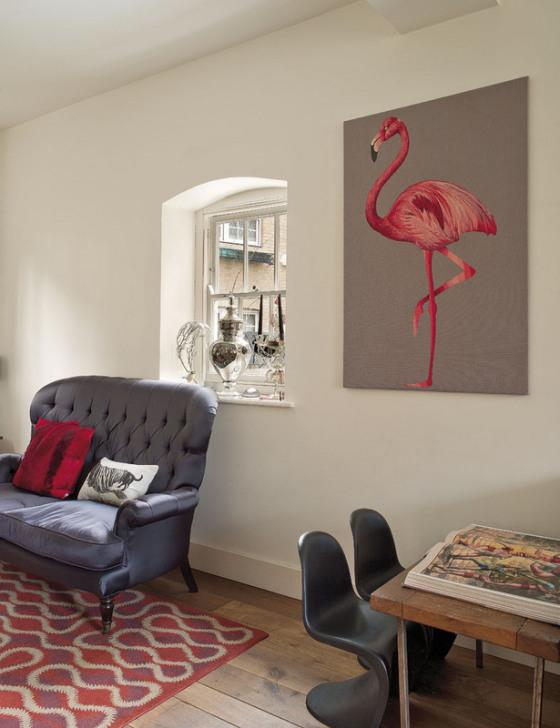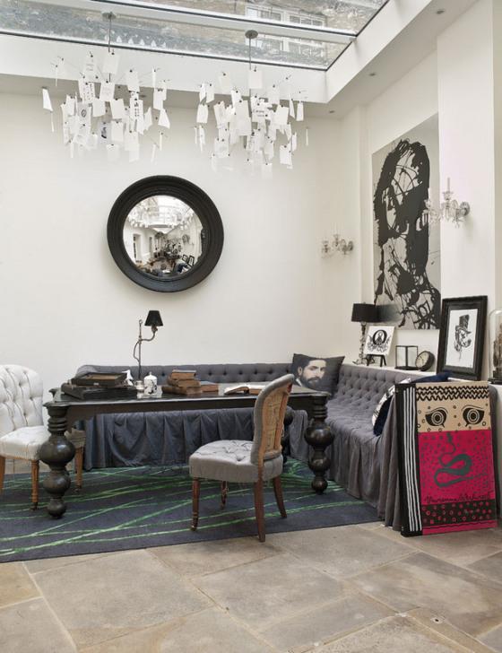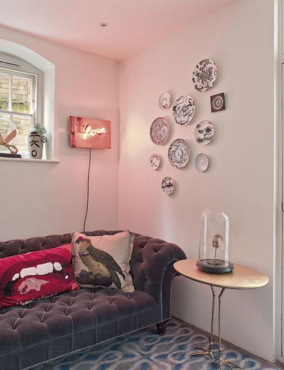 De las ideas que me anoto de esta casa, mención especial para las luces de neón como elemento decorativo, ya sea en forma de letras, una palabra (love) o una estrella. Y además, para mi casa me llevaría con los ojos cerrados, el tapiz de flamenco rosa, las butacas de terciopelo de seda que estan alrededor de la chimenea, las vasijas de Fornasetti, y como no, el cojín del gato con monóculo, diseño de Rory.